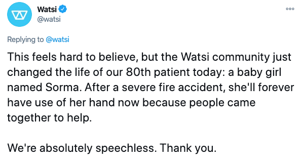 We're thrilled to share that our Watsi community showed up in ways bigger than we could've imagined for #GivingTuesday. Together we raised enough funds to support life-changing healthcare for 179 patients. Each of these patients and their families are now on a journey to leading healthier, fuller lives!